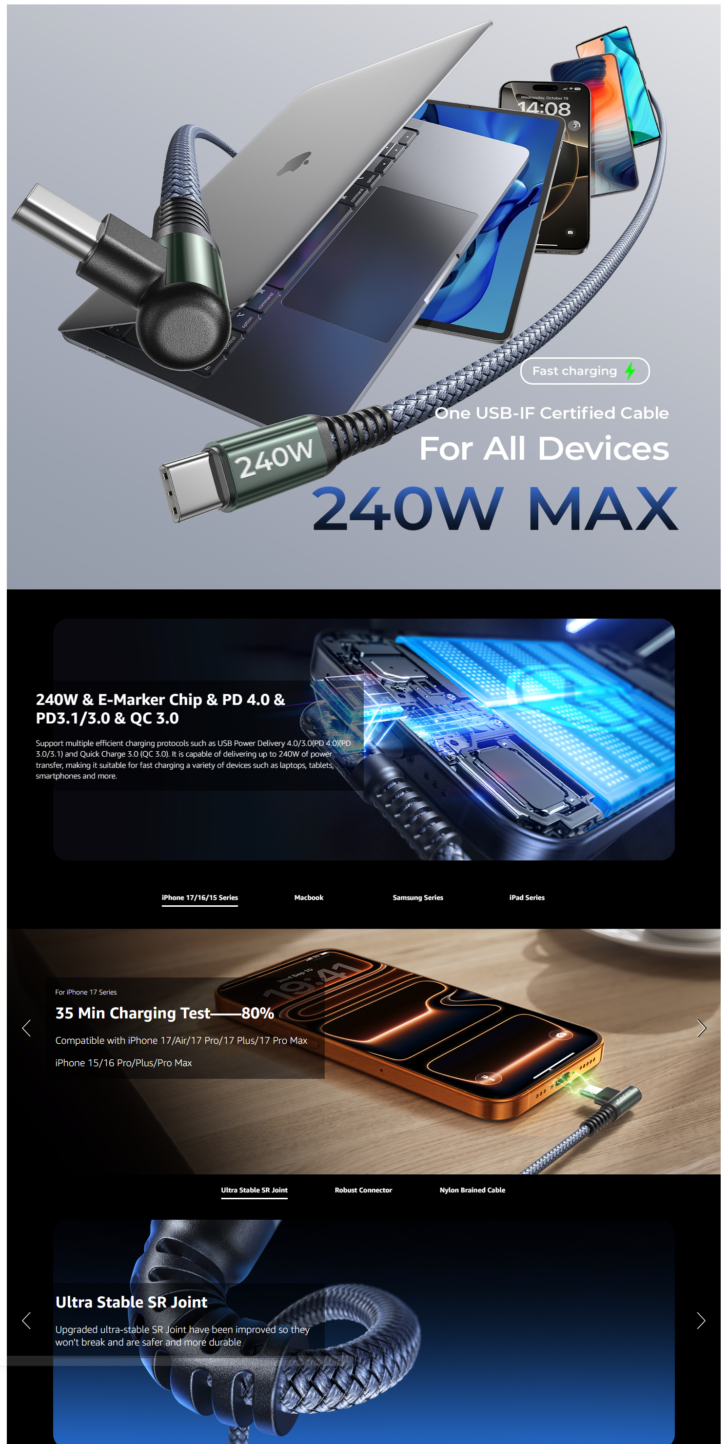 AINOPE 240W USB C to USB C Cable Fast Charging 15FT,Right Angle Fast Type C Charging Cable Fits iPhone 16 Pro Max Plus,iPhone 15